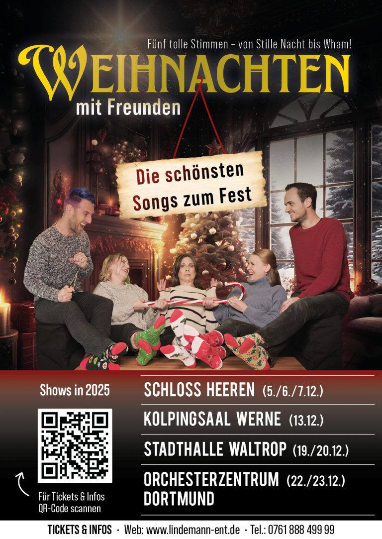 Mit unserem erfolgreichen Konzertformat “Weihnachten mit Freunden” gehen wir im Dezember 2025 in die nächste Runde! Fünf herausragende Sängerinnen und Sänger nehmen euch mit auf eine musikalische Reise voller Emotionen und Weihnachtszauber. Erlebt, wie sich der Konzertsaal bei Weihnachten mit Freunden in ein warmes, heimeliges Wohnzimmer verwandelt und die Magie der Weihnacht spürbar wird – mit den schönsten Songs und Liedern zum Fest.