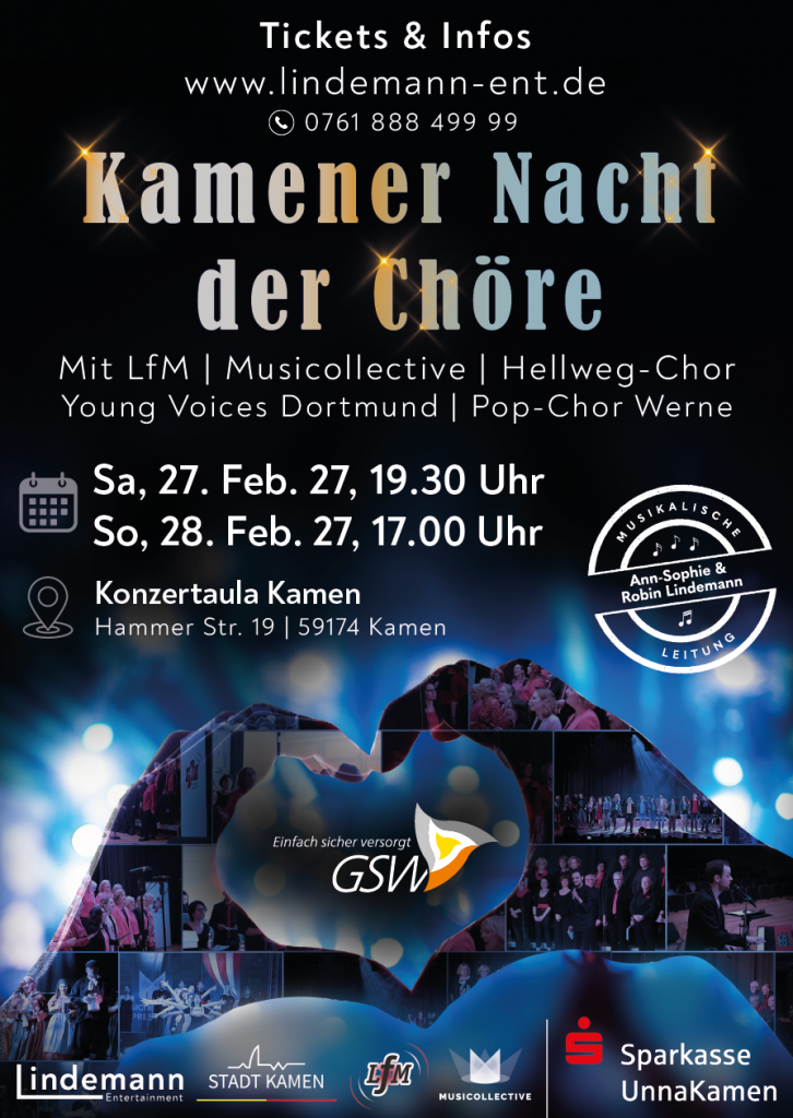 Das Chorkonzert des Jahres! Über 150 Sängerinnen und Sänger präsentieren in sechs Chören das Beste aus Pop, Rock und Musical. Mit dem Format zeigen wir, was Chor kann: Modern sein und Menschen verbinden und begeistern. Ich produziere die “Nacht der Chöre” mit unserem Start-up LINDEMANN Entertainment und stehe am Abend als Gastgeber und Chorleiter auf der Bühne. Also kommt am 25. und/oder 26. Oktober 2025 in die Konzertaula Kamen!